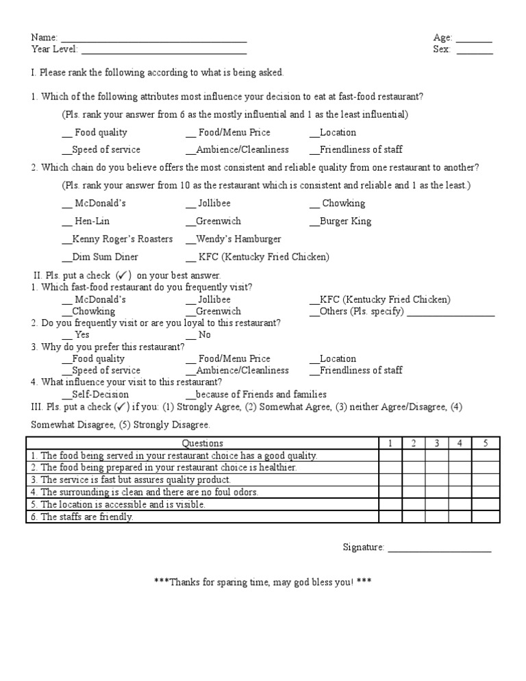 Questionnaire on fast food consumption from image.slidesharecdn.com Estimated nutritional intakes can then be derived from this. First, let's look at some survey tips to get you started. Dec 05, 2018 · jotform offers free patient satisfaction survey template that you can download, print and hand over to your patients. All the researcher has to guide him/her is a lengthy list of do's and don'ts born out of the experience of other researchers past and present. Restaurant survey questions template by questionpro offers a detailed questionnaire about restaurant services such as the lobby, table area, server, food quality, and willingness to recommend. Food companies and health outlets often use food frequency questionnaire forms to understand the eating habits of a targeted demographic or a general set of respondents. Unfortunately, questionnaire design has no theoretical base to guide the marketing researcher in developing a flawless questionnaire. Through these survey templates, the industry player.